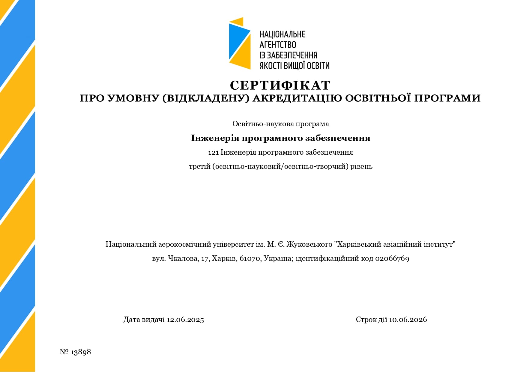 Термін дії сертифікатів про акредитацію спеціальностей/сертифікатів про акредитацію освітніх програм продовжено до 01.06.2026 р. відповідно до пункту 1 Постанови Кабінету Міністрів України «Про особливості акредитації освітніх програм, за якими здійснюють підготовку здобувачі вищої освіти, в умовах воєнного стану» від 16 березня 2022 р. № 295.