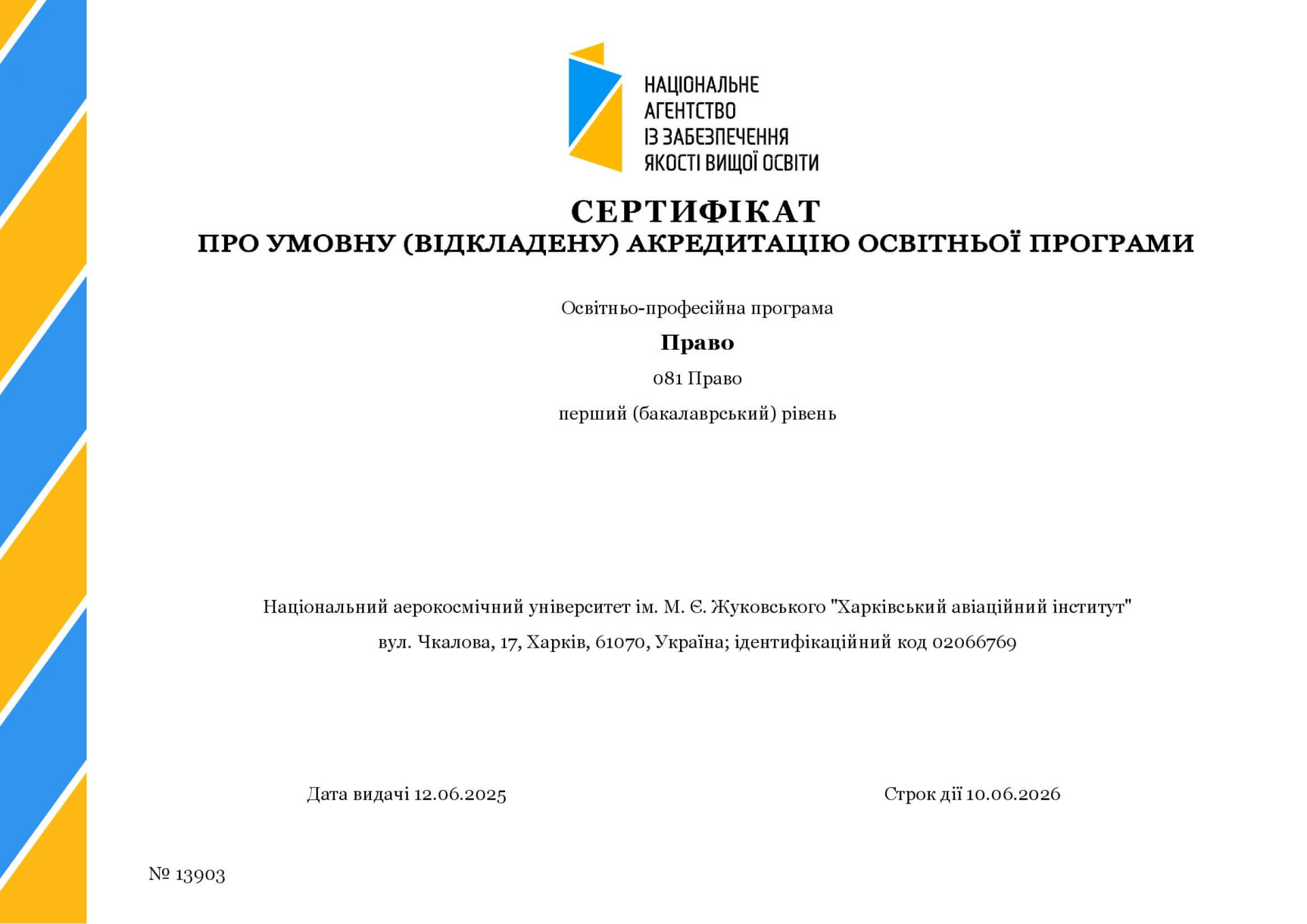 Наявність акредитації:Сертифікат про акредитацію освітньої програми: №13903, виданий 12 червня 2025 року. Період акредитації: до 10 червня 2026 року. Оновлення або модернізація освітньої програми здійснюється відповідно до розділу 5 Положення «Про розроблення та модернізацію освітніх програм в ХІА»