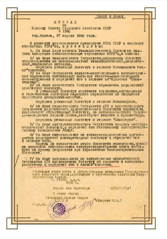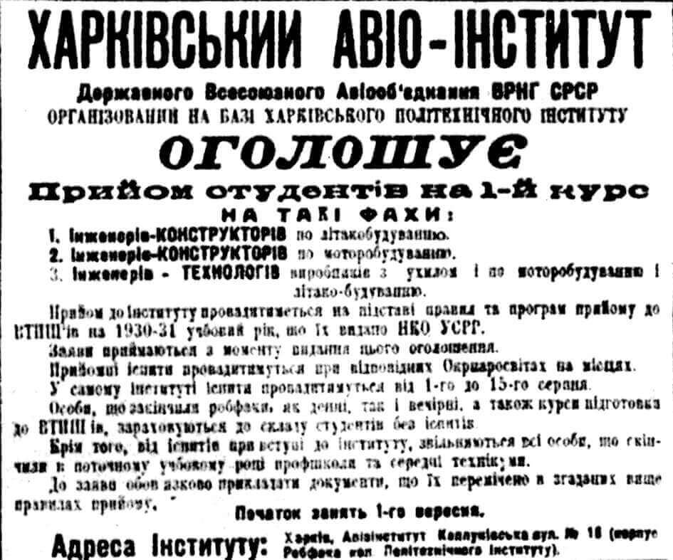17 квітня 1930 був опублікований наказ про реорганізацію Харківського технологічного інституту та прийнято рішення про створення ХАІ.