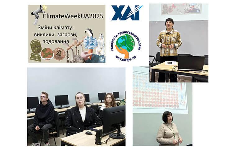 Співробітники кафедри екології та техногенної безпеки ХАІ долучилися до всеукраїнської ініціативи Climate Week UA від «Екодії». У захищеному просторі університету відбувся захід «Зміни клімату: виклики, загрози, подолання» — у змішаному форматі, з живим спілкуванням, переглядом тематичного фільму та щирими обговореннями.