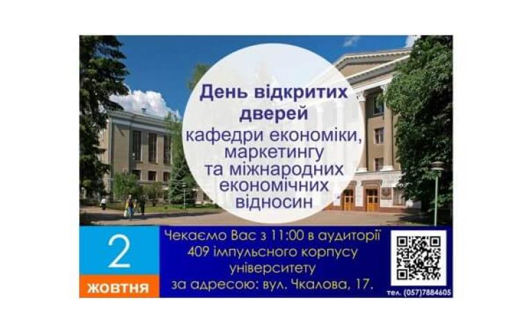 Шановні абітурієнти! Запрошуємо вас узяти учать у Дні відкритих дверей кафедри економіки, маркетингу та міжнародних економічних відносин, що відбудеться 2 жовтня 2021 р. в Національному аерокосмічному університеті ім. М. Є. Жуковського “Харківський авіаційний інститут” за адресою: імпульсний корпус, аудиторія 409, вул. Чкалова, 17.