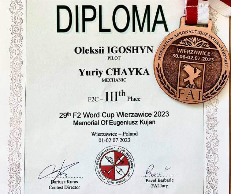 Незважаючи на військовий стан та неможливість проведення змагань в Україні, наші спортсмени взяли участь у Кубку світу з авіамодельних змагань в класах F2A, B, C, який проходив з 29 по 30 червня та з 01 по 02 липня 2023 року в м. Вержавіце (Польща).