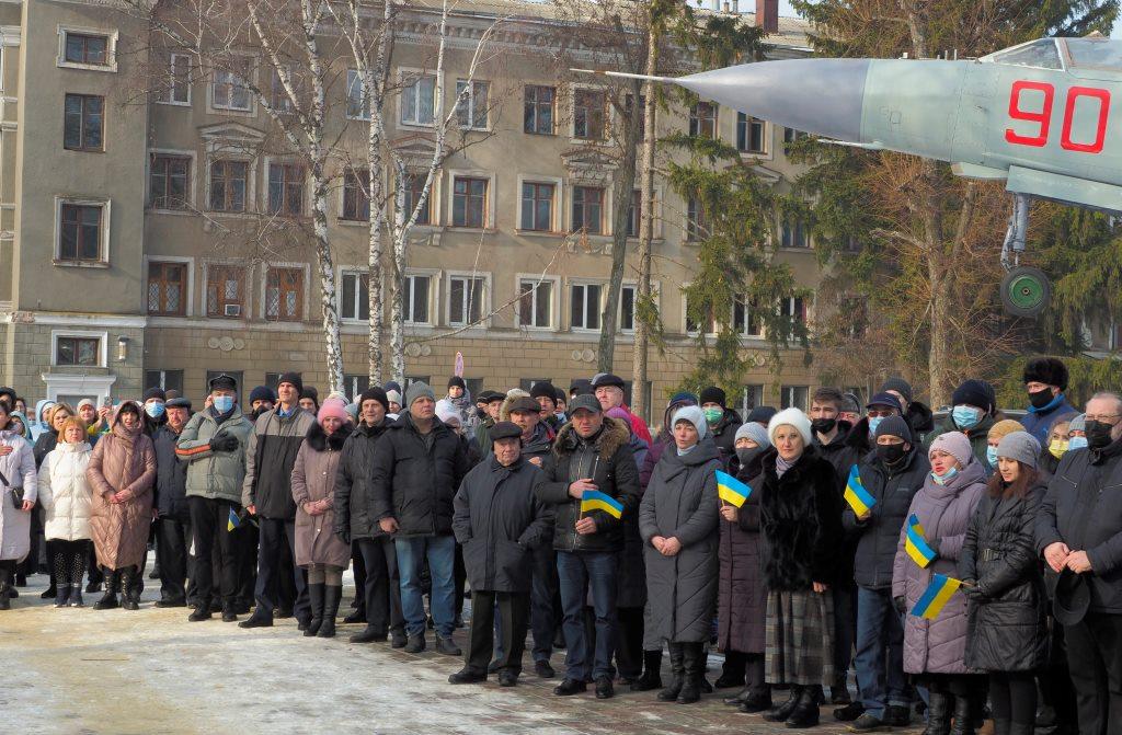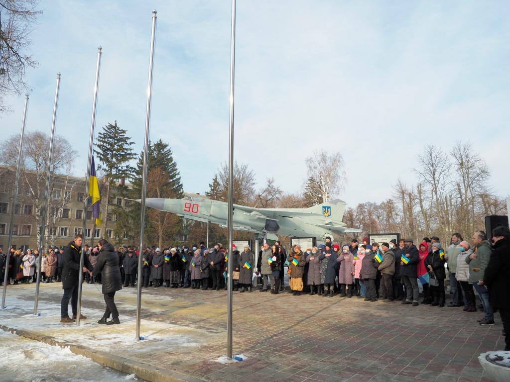 Сьогодні, 16 лютого, в оголошений Указом Президента України від 14.02.2022 № 53 День єднання «з метою посилення консолідації українського суспільства, зміцнення його стійкості в умовах зростання гібридних загроз, інформаційно-пропагандистського, морально-психологічного тиску на суспільну свідомість» на території нашої держави – на будинках і спорудах населених пунктів – відбулося урочисте підняття національного прапора. Зокрема, церемонію було проведено на головній прохідній ХАІ.