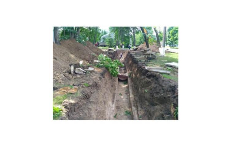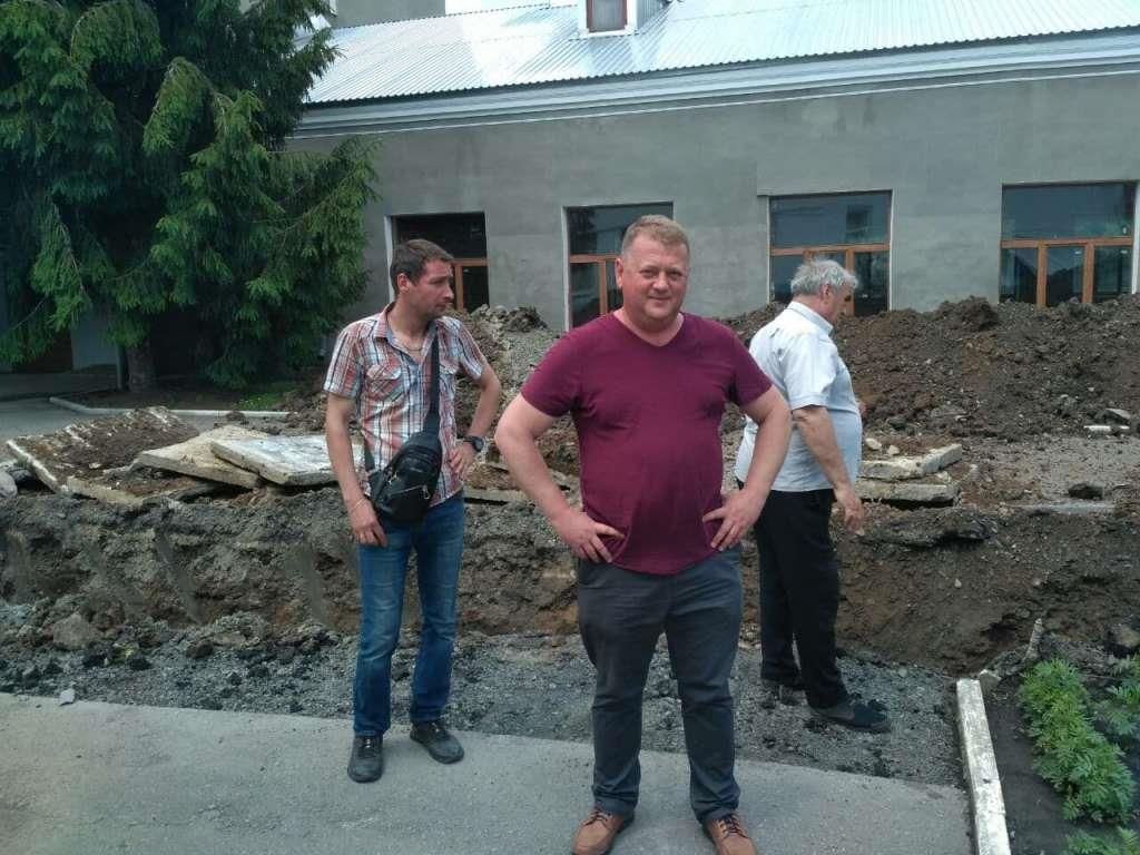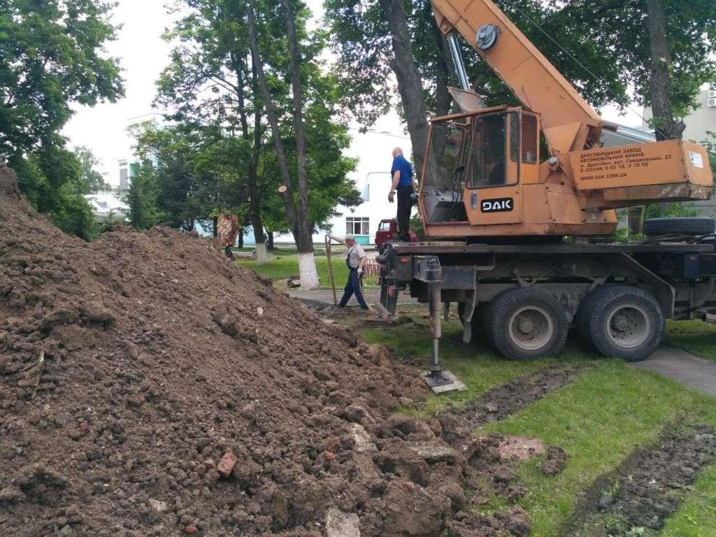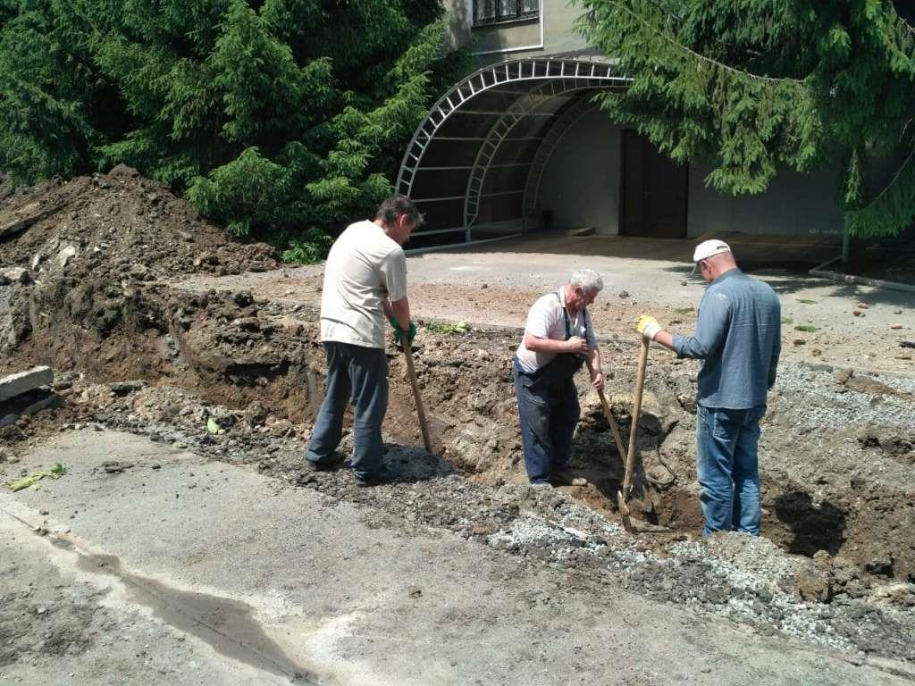 Позаду головного корпусу розрито траншеї. З лопатами ходять працівники, задіяно техніку.