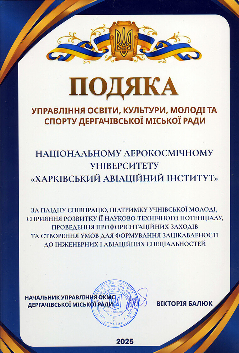 Університет отримав Подяку від Управління освіти, культури, молоді та спорту Дергачівської міської ради - за плідну співпрацю, підтримку учнівської молоді, сприяння розвитку її науково-технічного потенціалу та формування зацікавленості до інженерних і авіаційних спеціальностей.