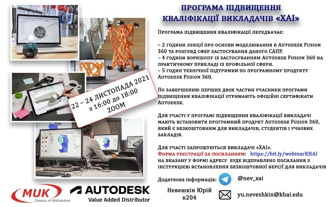 15/11/2021Програма підвищення кваліфікації викладачів ХАІ від компанії AutodeskРеєструйтеся за посиланням.