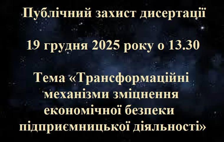 19 грудня 2025 року о 13.30 у Національному аерокосмічному університеті «Харківський авіаційний інститут» у режимі онлайн-конференції відбудеться публічний захист дисертації Сергія Підмогильного на здобуття ступеня доктора філософії в галузі знань 05 Соціальні та поведінкові науки за спеціальністю 051 Економіка на тему «Трансформаційні механізми зміцнення економічної безпеки підприємницької діяльності».