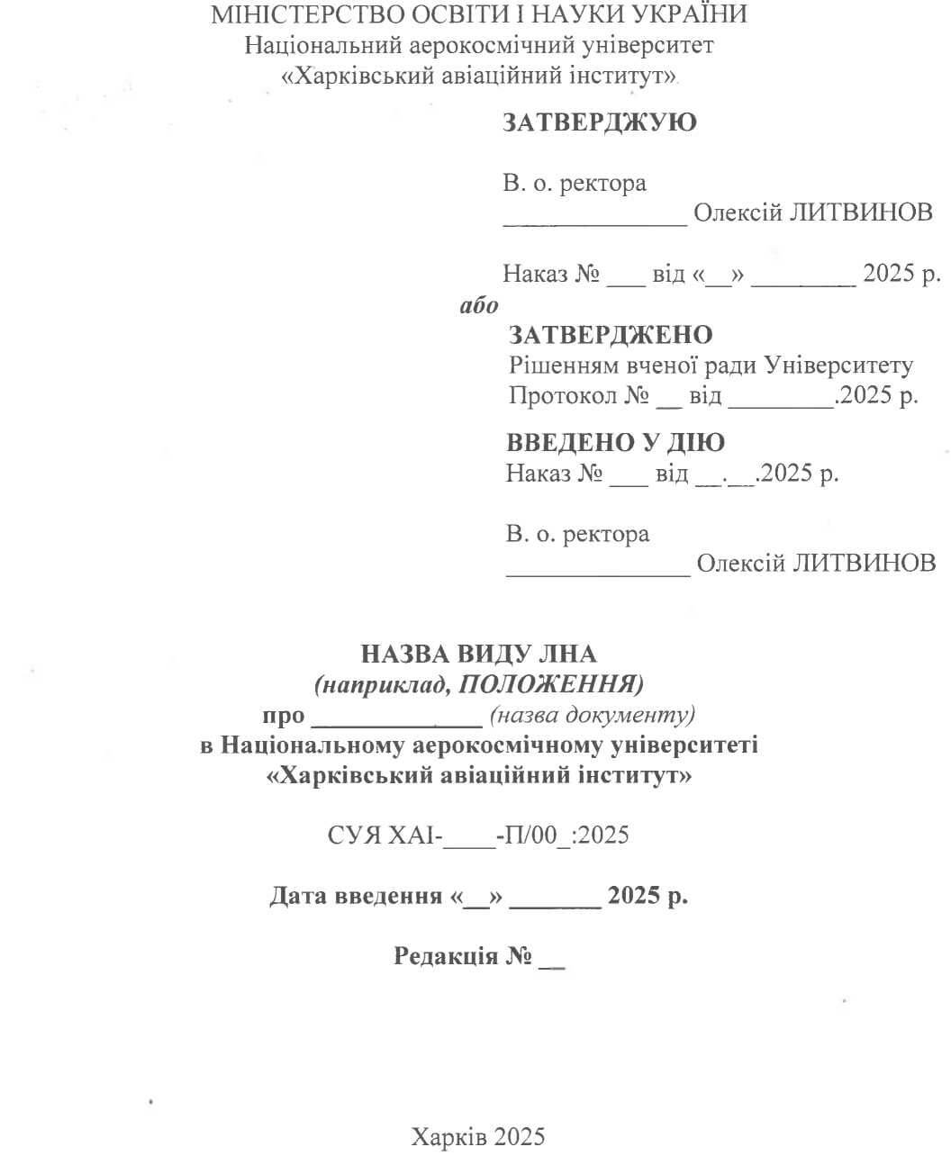 3.2. При розробленні проекту ЛНА (при створенні редакції № 1) реквізити системи управління якістю Університету (СУЯ ХАІ) зазначаються як абревіатура структурного підрозділу або органу управління, відповідального за створення ЛНА, наприклад: СУЯ ХАІ-ЦЯО-П/ОО1:2025, де ЦЯО - не більш перших 3 літер абревіатури назви структурного підрозділу - Центр якості освіти, акредитації та ліцензування, П -вид документа (Положення), 001 - порядковий номер для документів такого виду, що підготовлені цим структурним підрозділом (органом управління) у поточному календарному році, 2025 - це зазначення поточного календарного року.