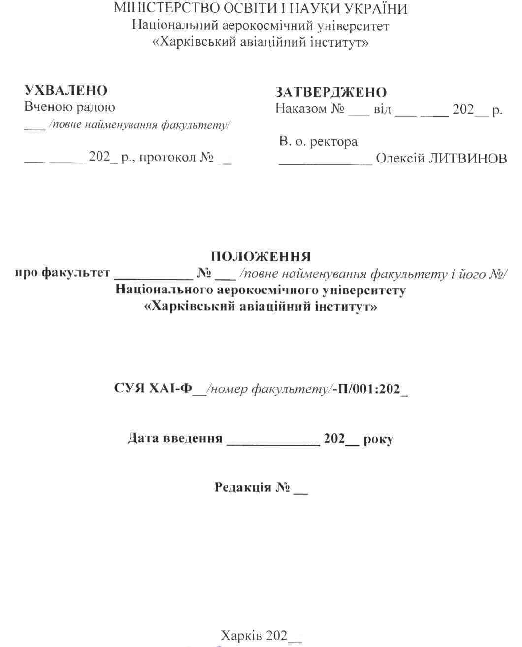 Наведені нижче у цьому Типовому положенні розділи 1-10 є обов’язковими для включення до Положення про конкретний факультет Університету. Текст Положення про конкретний факультет з урахуванням особливостей його діяльності повинно бути надруковано однаковим шрифтом (замість тексту з курсивом вказувати актуальні для факультету відомості), розробником документу вказувати декана факультету, перевіряючим вказувати керівника Центра якості освіти, ліцензування та акредитації. У колонтитулах до документу реквізити системи управління якістю вказувати як «СУЯ ХАІ-Ф /номер факультету/-П/001:202 ». Зразок титульного аркушу Положення про конкретний факультет наведено у Додатку А цього Типового положення.