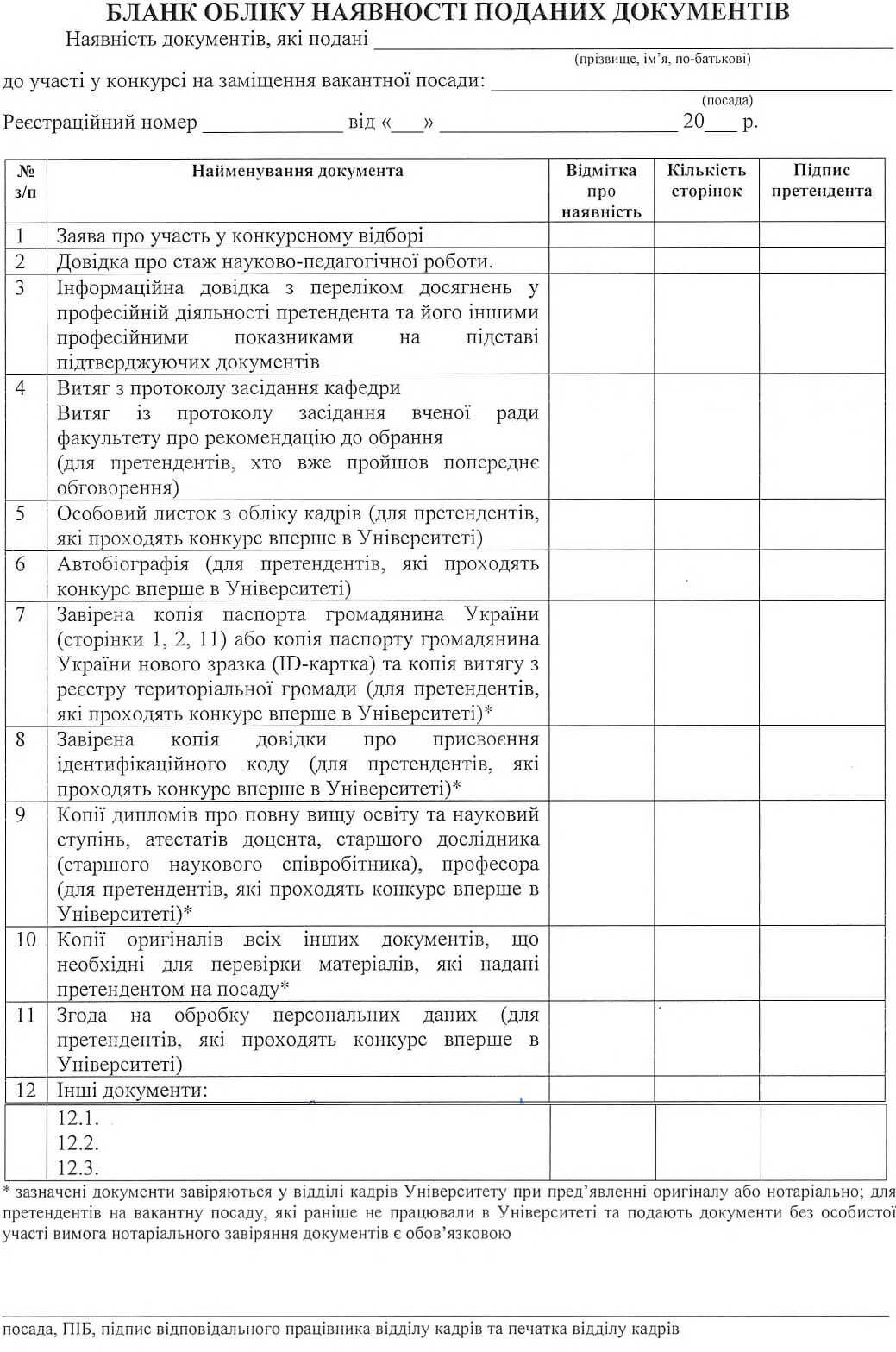*** зазначені документи завіряються у відділі кадрів Університету при пред’явленні оригіналу або нотаріально; для претендентів на вакантну посаду, які раніше не працювали в Університеті та подають документи без особистої участі вимога нотаріального завіряння документів є обов’язковою