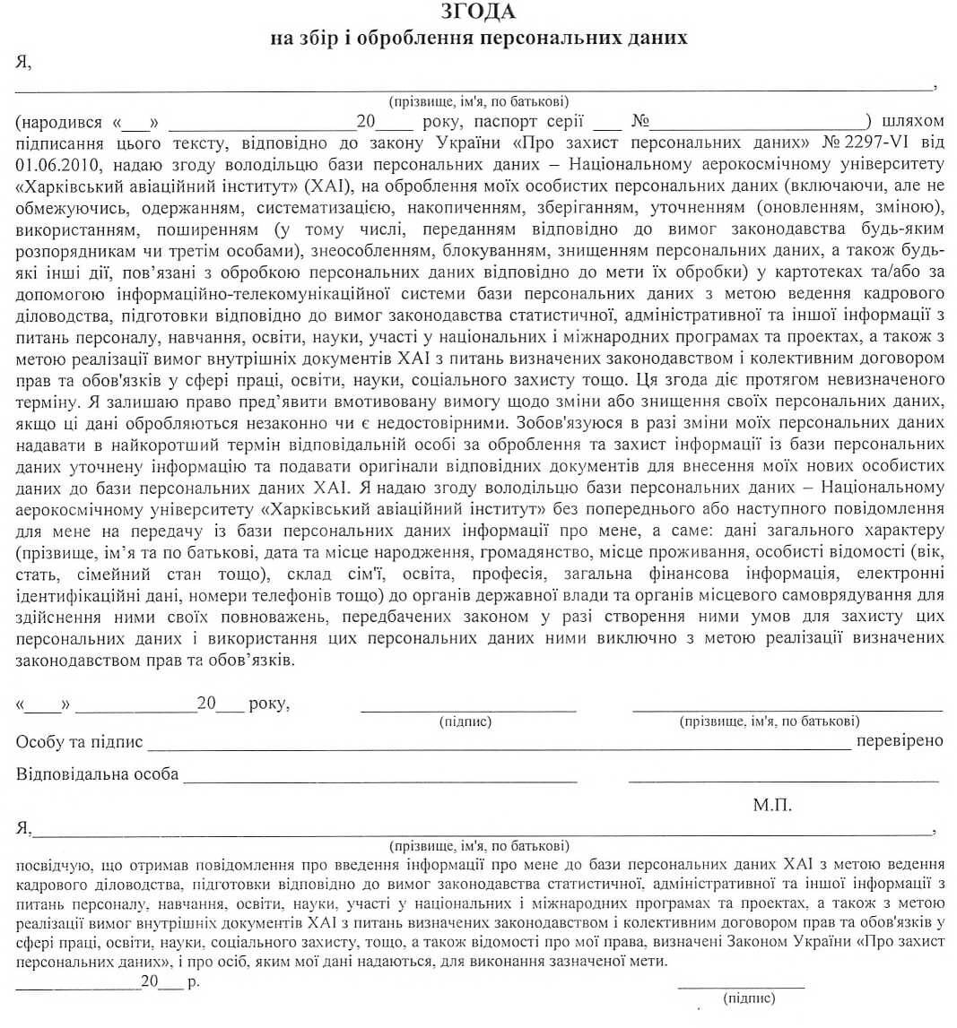 7) згода на обробку персональних даних (відповідно до додатку Г).