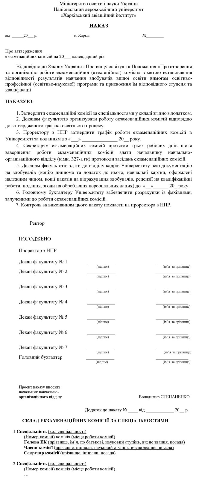 4.9. Проєкт наказу про персональний склад ЕК за встановленою формою (Додаток Б) подається на затвердження ректору Університету кожного року не пізніше 31 грудня.