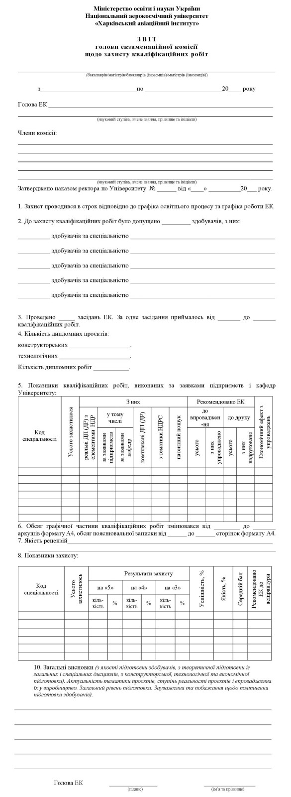 11.1. За підсумками роботи ЕК її голова складає загальний звіт щодо якості підготовки здобувачів, їх теоретичну підготовку із загальних і спеціальних дисциплін.
