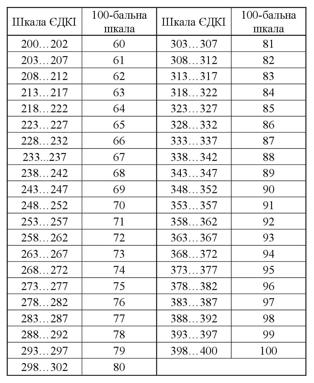 Таблиця переведення балів, отриманих за шкалою ЄДКІ, у 100-бальну шкалу
