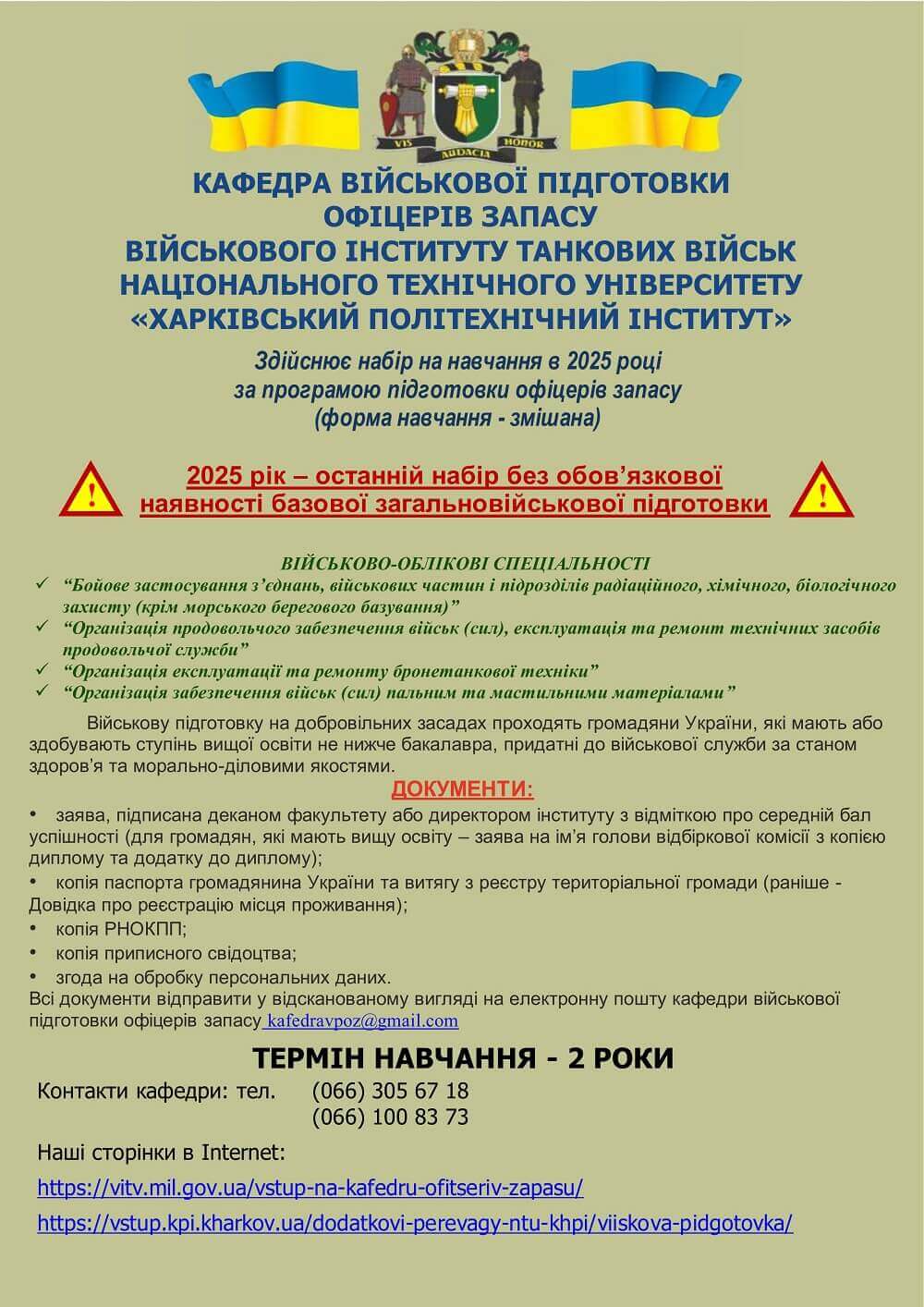 Кафедра військової підготовки офіцерів запасу Військового інституту танкових військ Національного технічного університету "Харківський політехнічний інститут" оголошує набір студентів на навчання у 2025 році.